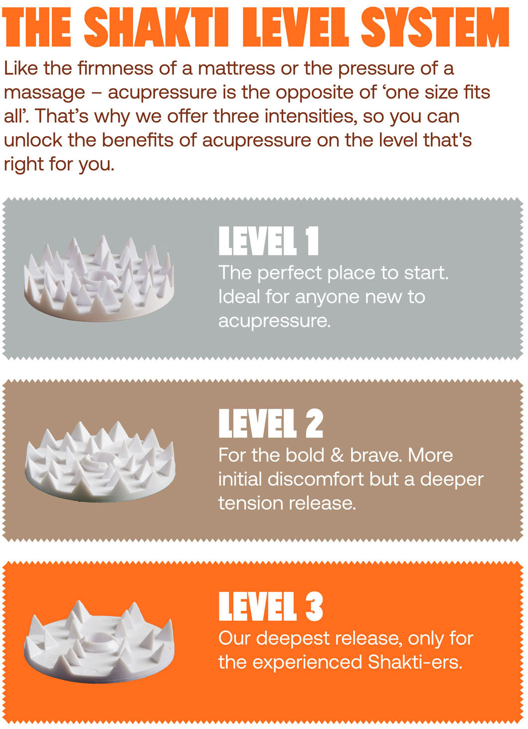 2. Shakti spikes are much sharper than anything else out there.Like the firmness of a mattress or the pressure of a massage – acupressure is the opposite of ‘one size fits all’. If you go too far in the beginning you’re less likely to build a solid habit. It’s why we offer three intensities that all unlock the benefits of acupressure.